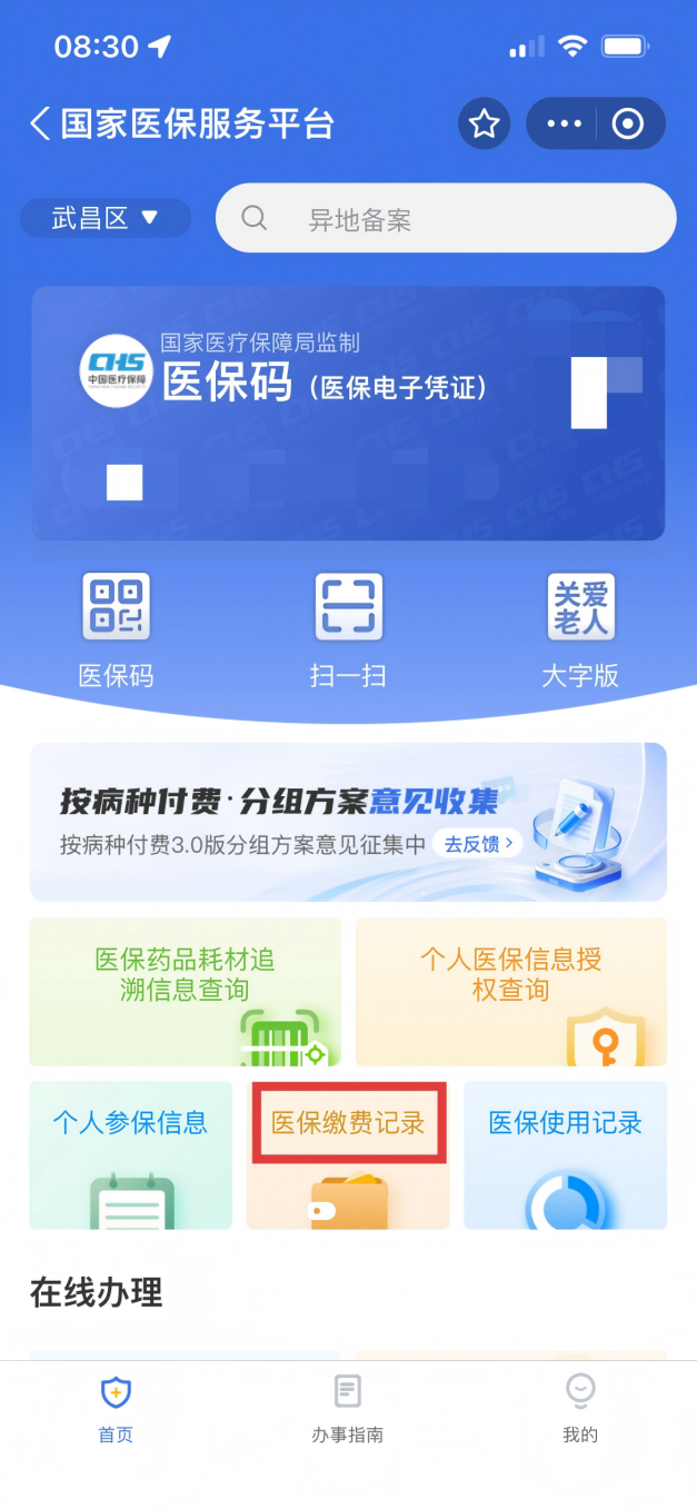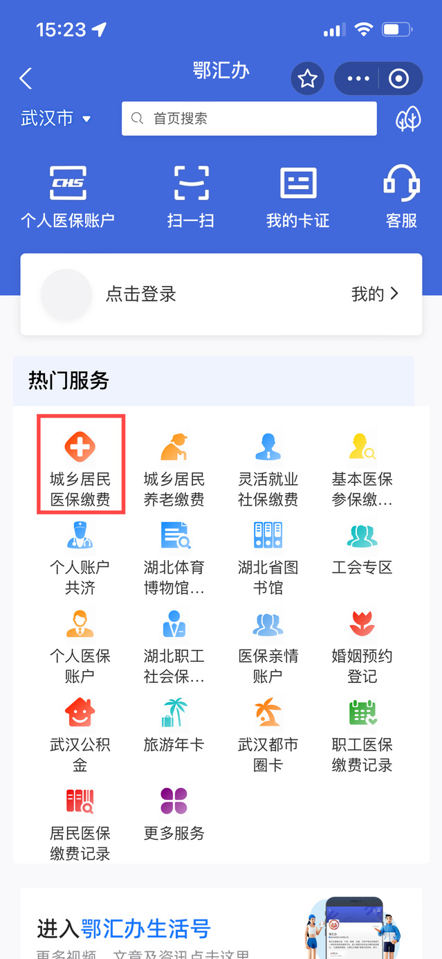 2.确认无误后,进入支付宝“鄂汇办”小程序,点击“城乡居民医保缴费”。